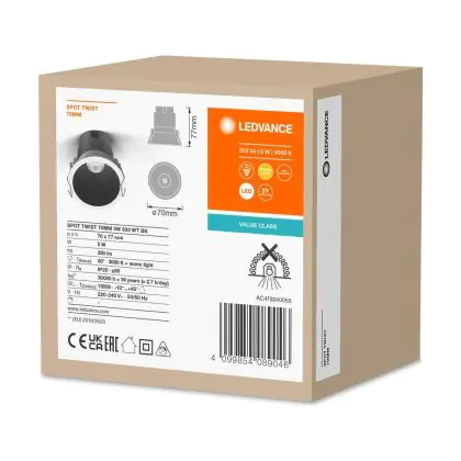 Goed om te weten is dat deze LED inbouwspot een zaagmaat heeft van 65mm en een diameter van 70mm. Dit wil zeggen dat het gat in het systeemplafond of het verlaagde plafond een afmeting dient te hebben van 65mm om het armatuur stevig in het plafond te bevestigen. De spot zelf is voorzien van twee handige klemmetjes, die uitzetten zodra het armatuur in de gat is geplaatst. Zo geregeld dus! Vanaf het moment van aanschaf ontvang je 3 jaar all-in garantie. Hierdoor ben je verzekerd dat de inbouwspot ook doet wat die hoort te doen: zonder problemen een ruimte verlichten!