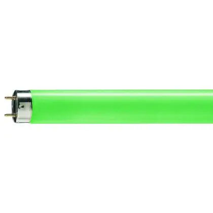De lamp geeft een groene lichtkleur. Let op: wanneer de TL buis uitstaat is de buis niet groen van kleur, maar wit.